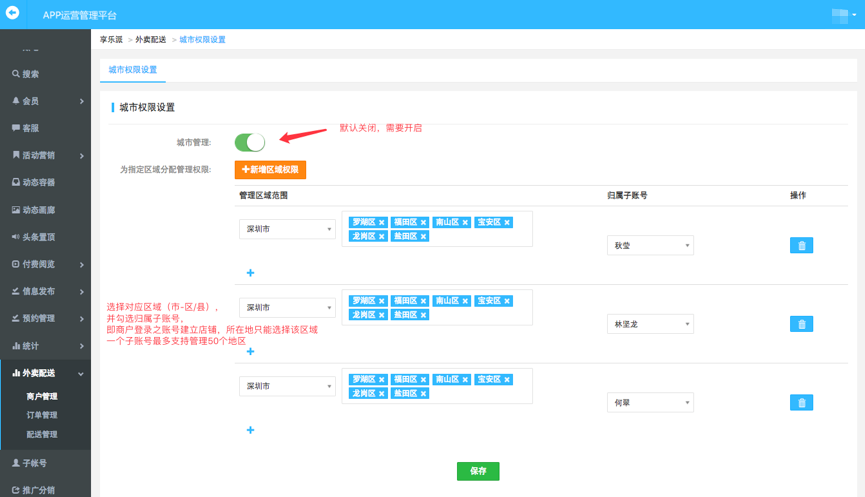 9.  城市管理,用于子賬號建立/管理店鋪,子賬號只能在所分配的區(qū)域內(nèi)進行店鋪建立以及管理。未勾選的區(qū)域不可選擇操作