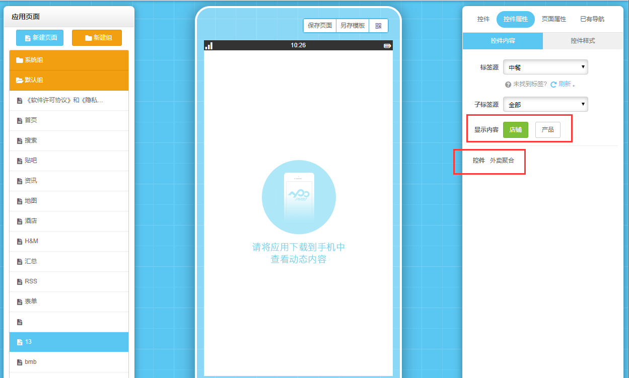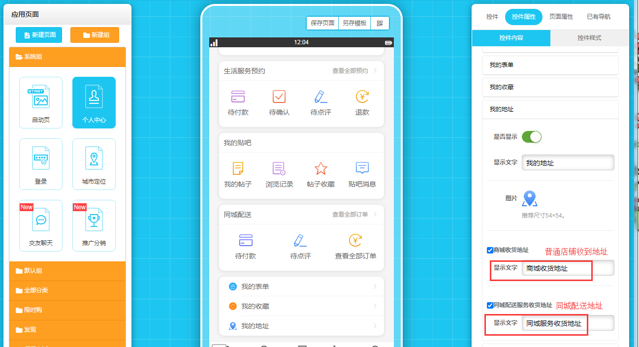 11.    運營管理后臺配置完成之后,回到制作頁面建立頁面展示插件內(nèi)容,外賣功能共有三個插件,分別為:同城配送商戶(單商戶)、同城配送聚合(多商戶展示)、同城配送分類(顯示標簽以及子標簽內(nèi)容)