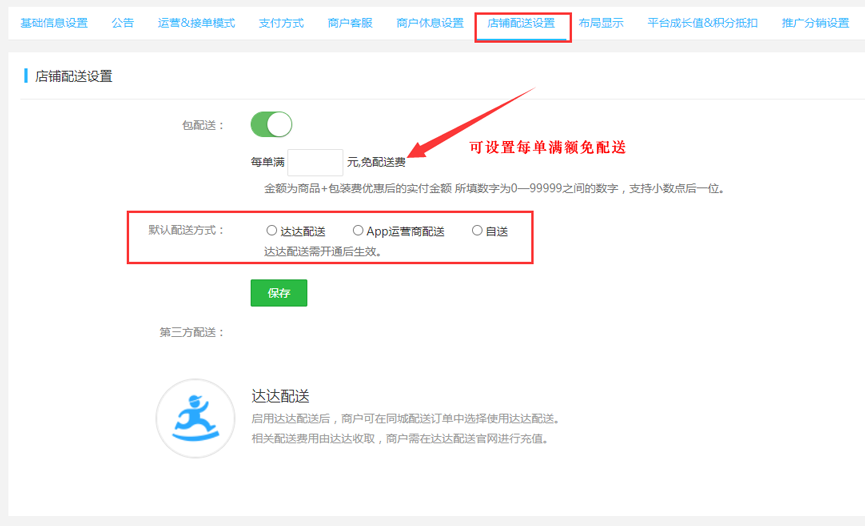 6.  店鋪配送方式,支持App運營商配送即使用騎手端商戶自送以及接入達達配送方式。