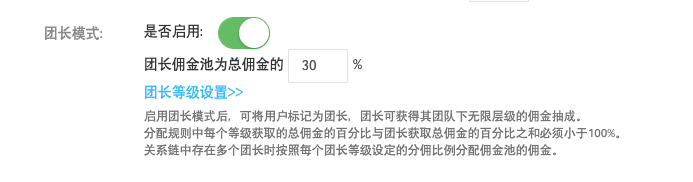 1.新增多團(tuán)長(zhǎng)功能,支持一條關(guān)系鏈中多個(gè)團(tuán)長(zhǎng)同時(shí)獲得傭金。一條關(guān)系鏈中同時(shí)存在多個(gè)團(tuán)長(zhǎng)時(shí),采用代差分傭模式,高等級(jí)的團(tuán)長(zhǎng)能獲得其團(tuán)長(zhǎng)傭金比例與低等級(jí)團(tuán)長(zhǎng)傭金比例差額的傭金,低等級(jí)或同等級(jí)的團(tuán)長(zhǎng)無(wú)法獲得團(tuán)長(zhǎng)傭金。