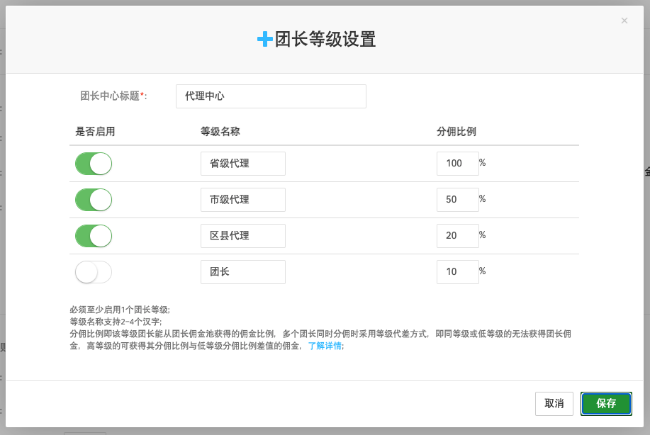 若省級(jí)代理設(shè)置的團(tuán)長(zhǎng)傭金比例為100%,市級(jí)代理為50%,區(qū)縣代理設(shè)置為20%;