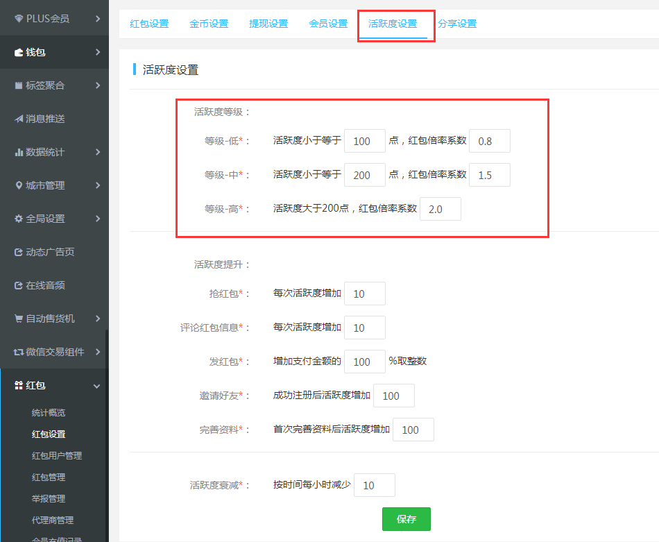 活躍度設置:不同的活動度的用戶可以設置不同的紅包倍率系數(shù),倍率系數(shù)影響紅包大小,同時設置好活躍度的提升