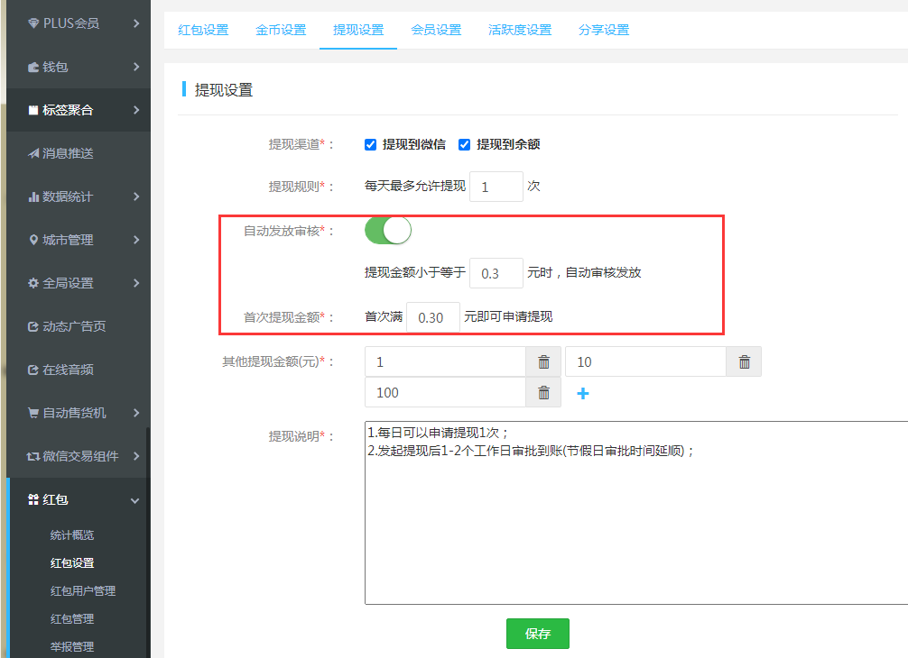 提現(xiàn)設置:可設置提現(xiàn)到微信和余額(提現(xiàn)到余額的前提下需要開通“錢包”插件)。