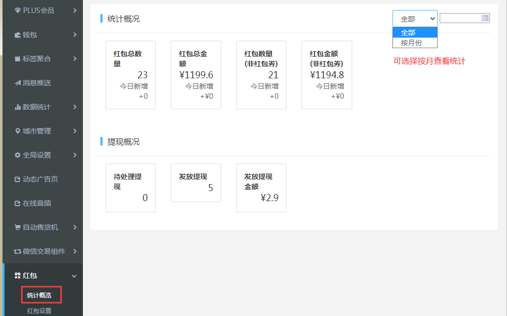 1.統(tǒng)計概覽:基本統(tǒng)計信息頁面,可在右上角選擇按月查看