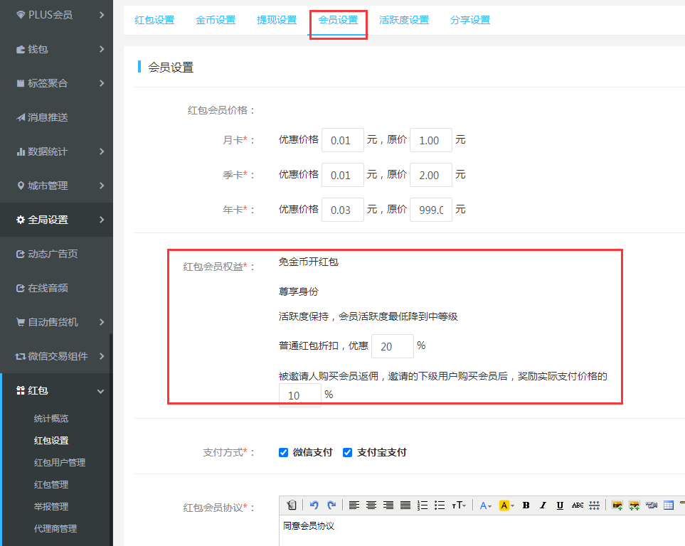 會員設置:用戶購買紅包會員扣可以享受相應紅包會員權益