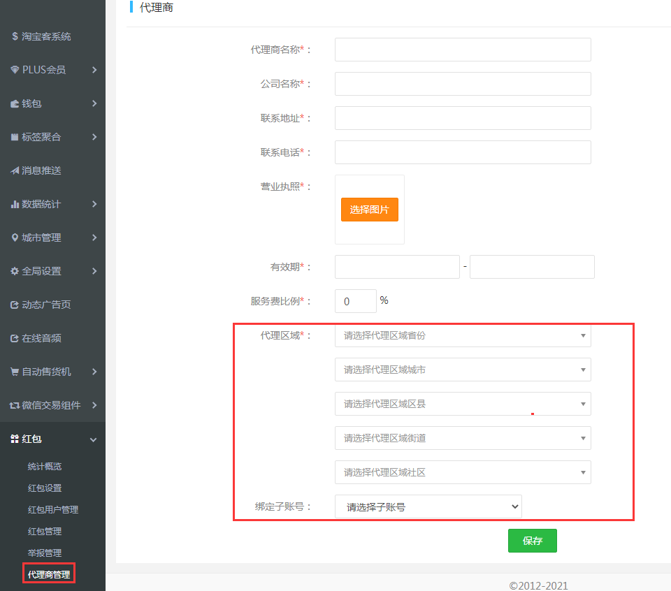可精確至村鎮(zhèn)街道設定代理商。代理商可對區(qū)域范圍內用戶的紅包進行管理,且能按照設定比例從紅包服務費分成。