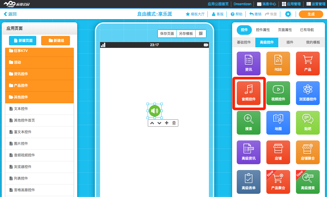 在制作頁(yè)面右側(cè)的高級(jí)控件中選中音頻控件,并拖入制作頁(yè)面。