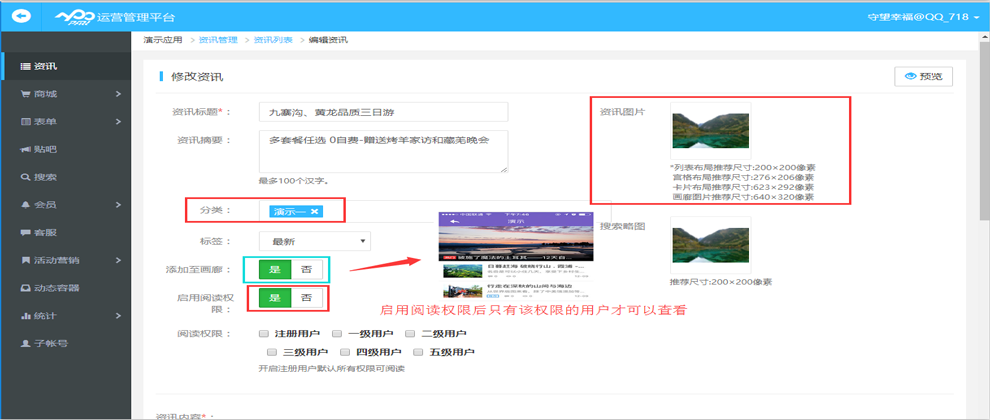 4.進(jìn)入編輯頁(yè)面后,按照要求進(jìn)行填寫(xiě),其中列表題圖大小根據(jù)您在制作頁(yè)面中選擇是展示方式而變化。資訊內(nèi)容中的圖片寬度最大應(yīng)為640像素。該頁(yè)面上傳的所有圖片均應(yīng)控制在200KB以內(nèi)。在這一頁(yè)的資訊分類選項(xiàng)中選中你要將這條資訊分到的類別中,此條資訊我分到了所有的分類中。完成后,將剩余選項(xiàng)勾選好,點(diǎn)擊確定即可。