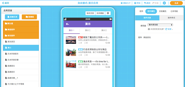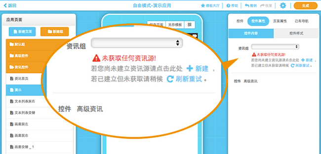 1.新建頁(yè)面,并在“高級(jí)控件”中選擇“高級(jí)資訊”控件,將其拖入模擬器中。為了有良好的展示效果,“高級(jí)資訊”控件的大小是不允許編輯的,默認(rèn)填充整個(gè)頁(yè)面