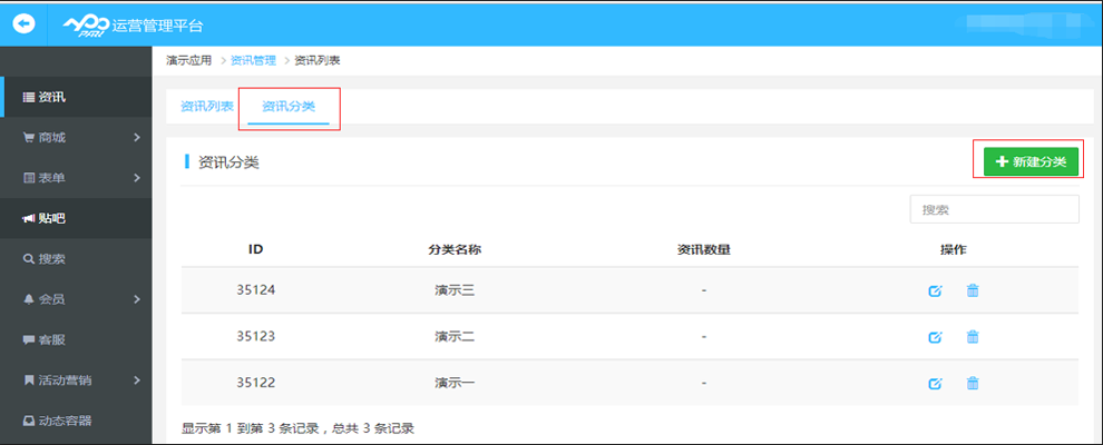 3.在資訊管理中選擇您要?jiǎng)?chuàng)建資訊的應(yīng)用,按照需求進(jìn)行“新建資訊源”,然后通過(guò)“管理分類”進(jìn)行添加分類。在我的應(yīng)用中,我建立了4個(gè)資訊組,這里挑選“演示資訊組”為大家做演示。我在這個(gè)資訊組中建立了3個(gè)分類,分別為“演示一”、“演示二”、“演示三”。這些都建好后,就開(kāi)始添加資訊了。