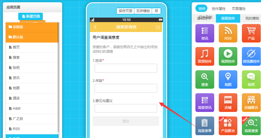 運(yùn)營(yíng)管理后臺(tái)建立好表單之后,打開(kāi)制作頁(yè)面,將“高級(jí)表單”控件拖入模擬器中;(頁(yè)面自帶返回鍵,無(wú)需設(shè)置返回鍵)