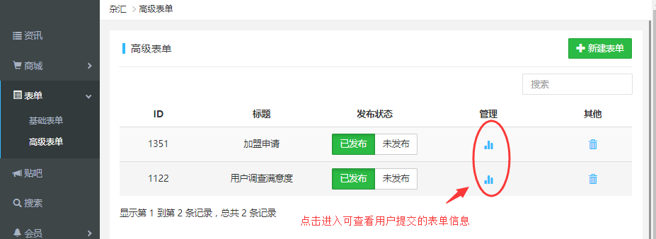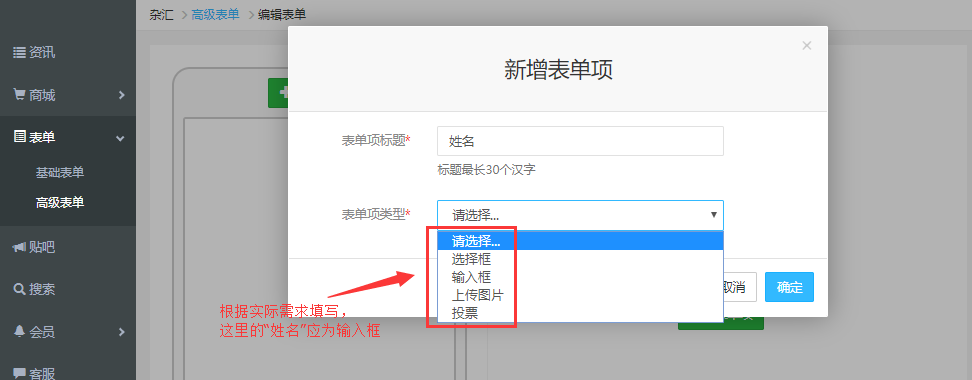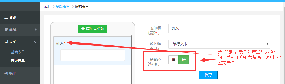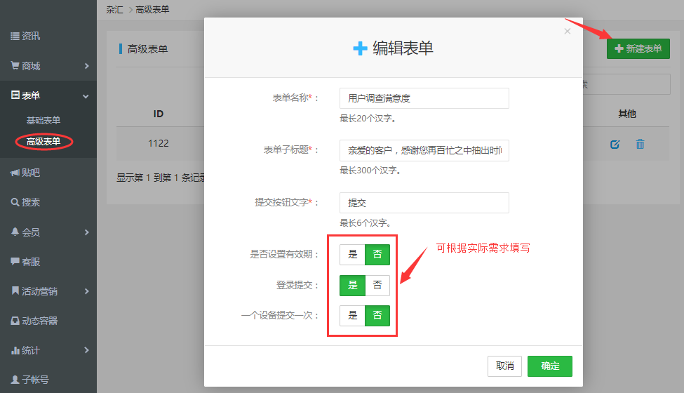 進(jìn)入運(yùn)營(yíng)管理后臺(tái),點(diǎn)擊進(jìn)入高級(jí)表單管理,新建表單;編輯表單名稱、標(biāo)題等;