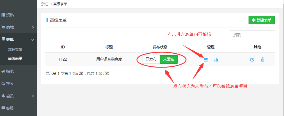 高級(jí)表單基礎(chǔ)設(shè)置完成之后,進(jìn)入表單內(nèi)容編輯,發(fā)布狀態(tài)必須為未發(fā)布,否則無(wú)法進(jìn)行表單編輯