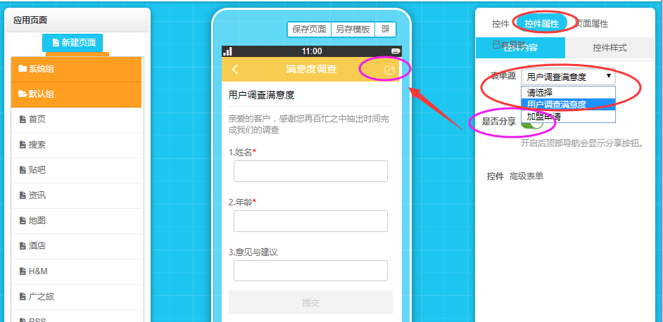 在“控件屬性”——“控件內(nèi)容”中,獲取已經(jīng)建立好的表單源,打開(kāi)分享按鈕,在手機(jī)端用戶可進(jìn)行表單分享(需先獲取分享功能,具體可聯(lián)系在線客服咨詢)