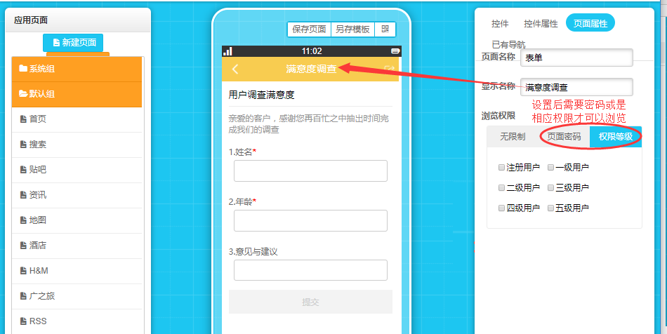 在“頁(yè)面屬性”中可設(shè)置名稱、權(quán)限以及背景顏色。設(shè)置顯示名稱,顯示于表單頂部(可選擇性設(shè)置);瀏覽權(quán)限打開(kāi)設(shè)置之后,需獲取相應(yīng)的信息及內(nèi)容才能瀏覽,