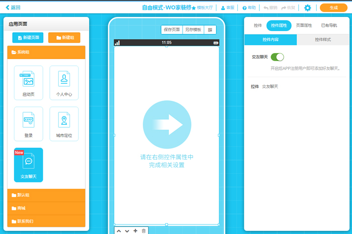 2.再點擊“交友聊天”,點擊一下中間的模擬器后,打開右側(cè)的“交友聊天”開關(guān)就已經(jīng)生效了,如果需要使用,點擊右上角“生成”,然后發(fā)布應(yīng)用/發(fā)布更新即可。