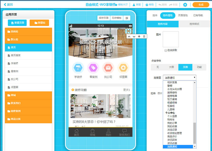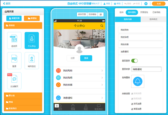 1.首先打開制作頁面左側(cè)系統(tǒng)組中的“個人中心”,開啟“消息通知”按鈕。