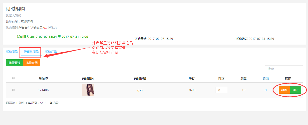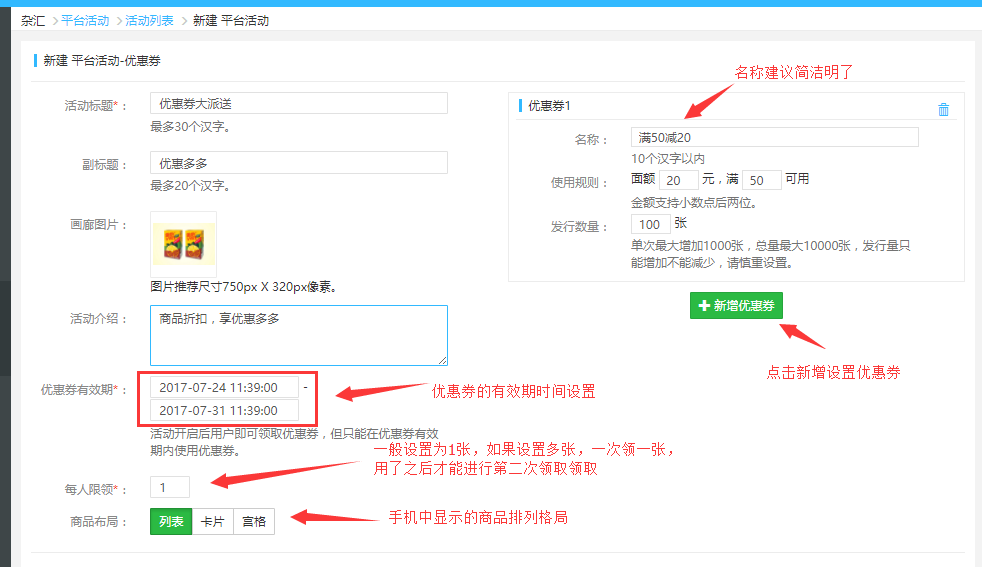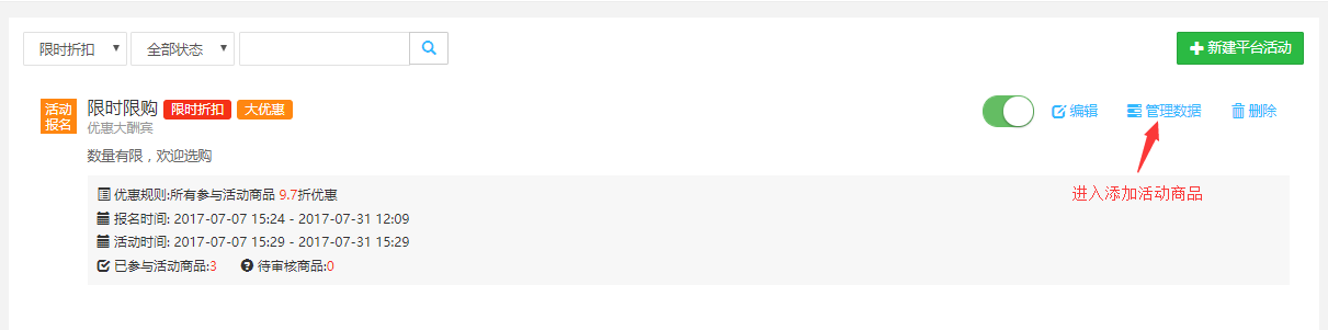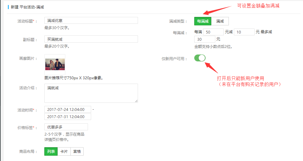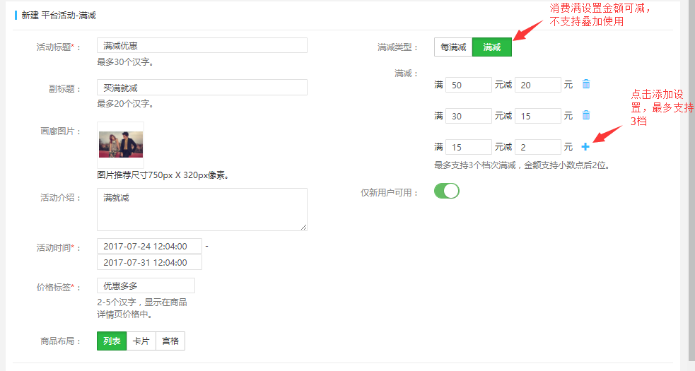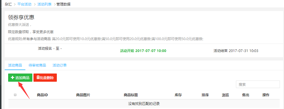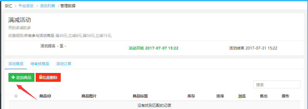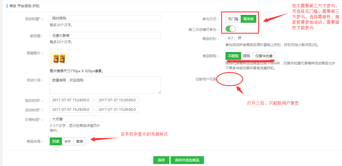*設(shè)置完成之后,點(diǎn)擊“保存”,僅保存并跳轉(zhuǎn)回活動顯示頁面;點(diǎn)擊“保存并追加商品”會跳轉(zhuǎn)到添加商品頁面
