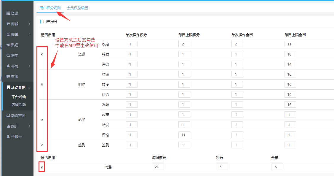 b.支持單項(xiàng)操作積分設(shè)置及單項(xiàng)每日上限積分設(shè)置