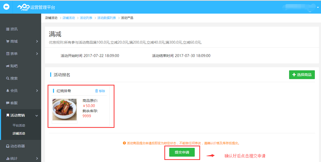 新建店鋪活動(dòng)選擇滿減,點(diǎn)擊下一步填寫(xiě)好各項(xiàng)滿減速活動(dòng)內(nèi)容提交申請(qǐng)后即可選擇添加活動(dòng)的產(chǎn)品