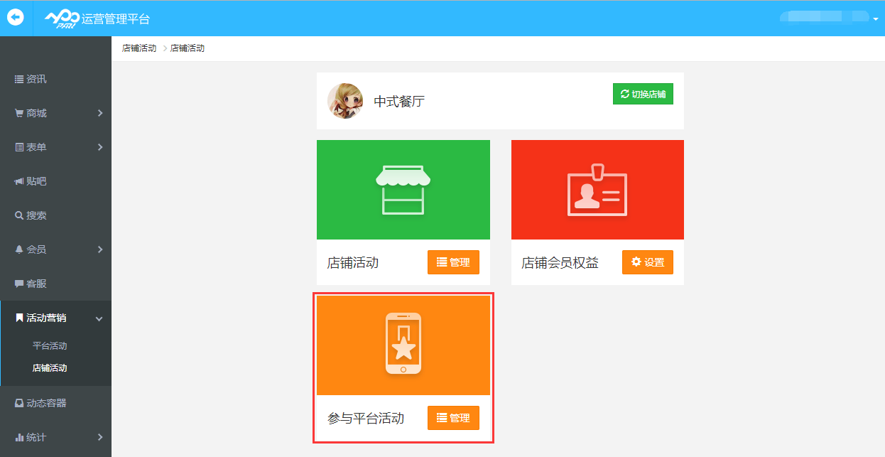 點(diǎn)擊“切換店鋪”可以選擇需要設(shè)置活動(dòng)營(yíng)銷(xiāo)的店鋪,點(diǎn)擊店鋪“管理”