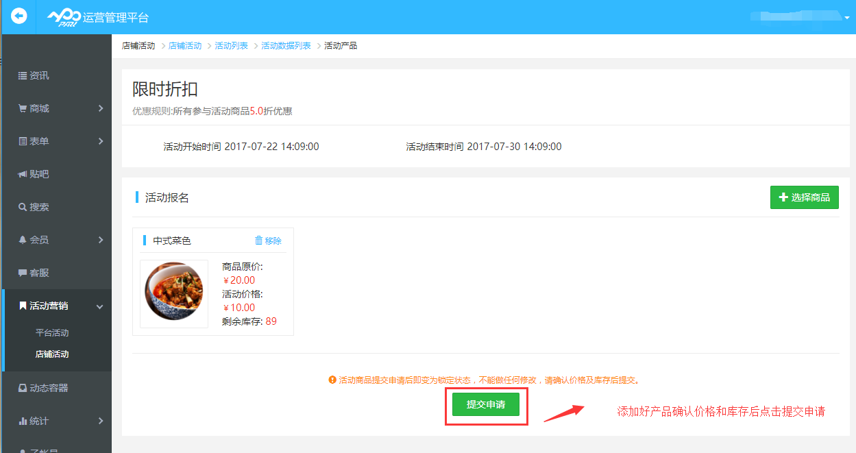 新建店鋪活動(dòng)選擇限時(shí)折扣,點(diǎn)擊下一步填寫(xiě)好各項(xiàng)限時(shí)折扣活動(dòng)內(nèi)容提交申請(qǐng)后即可選擇添加活動(dòng)的產(chǎn)品