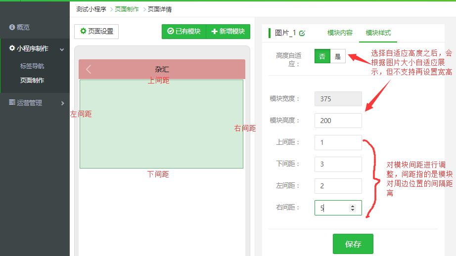 3.在模塊樣式設(shè)置模塊大小,寬度是固定的,不支持修改,只能調(diào)整模塊高度,選擇模塊自適應(yīng)高度,會根據(jù)上傳的的圖片自適應(yīng)顯示,