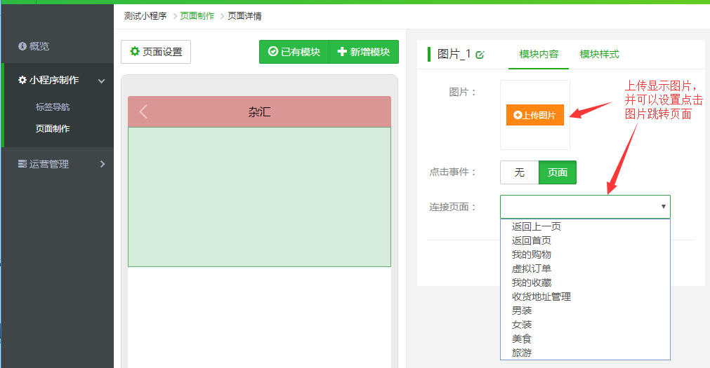 2.新增模塊之后,點擊模塊,在右側(cè)的模塊內(nèi)容上傳顯示圖片, 并可以設(shè)置跳轉(zhuǎn)頁面,