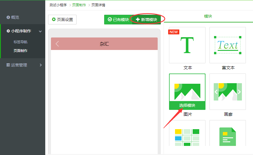 1.建立/選擇頁面,點擊新增模塊,選擇圖片模塊。