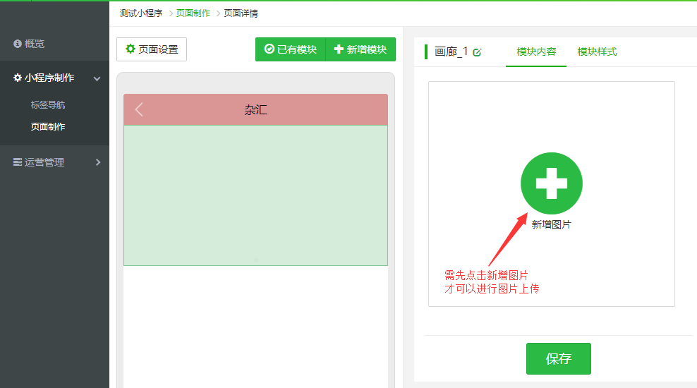 2.選擇模塊之后,在右側模塊內(nèi)容上傳圖片,先點擊新增圖片,才可以上傳圖片