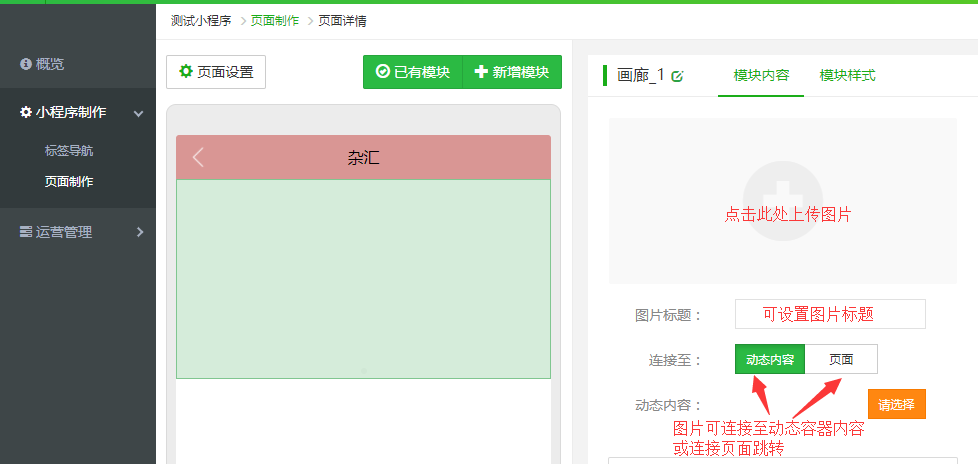 圖片可以上傳多張,編輯圖片標題,設置鏈接頁面,可以鏈接動態(tài)內(nèi)容(運營管理里建立),或者鏈接其他頁面跳轉。