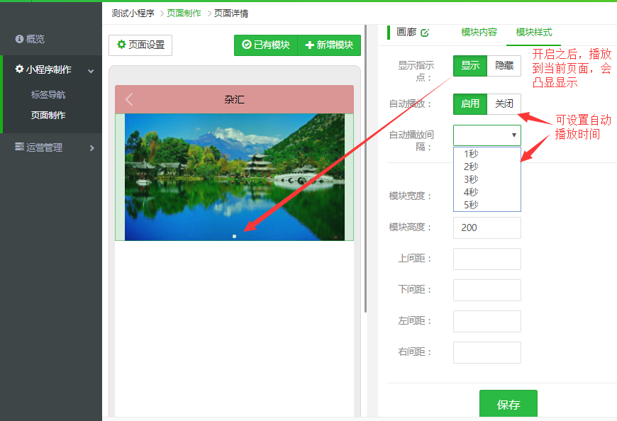 在模塊樣式中,可設置圖片自動播放,以及圖片播放間隔時長