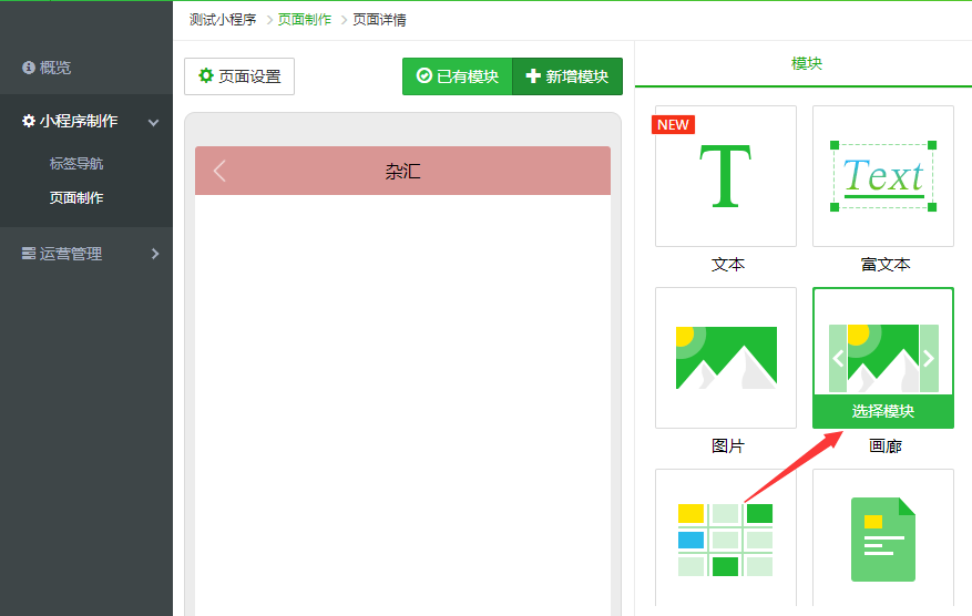 1.進入小程序制作頁面,建立編輯的頁面,選擇畫廊模塊。