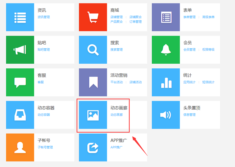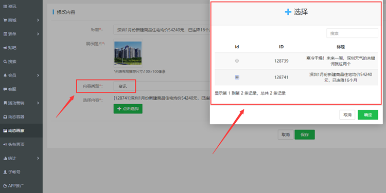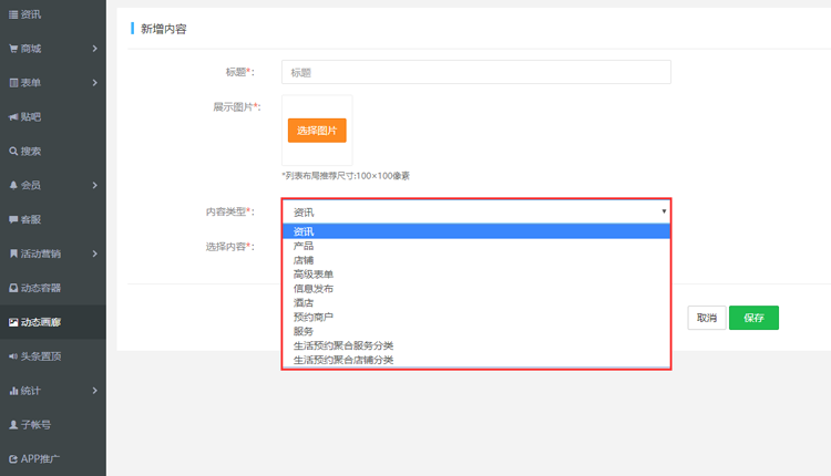 3、完成動(dòng)態(tài)畫(huà)廊設(shè)置后,新建內(nèi)容。填入標(biāo)題、上傳展示圖片、選擇內(nèi)容類型(資訊、產(chǎn)品、店鋪、高級(jí)表單等等),選擇之后,可對(duì)應(yīng)勾選此類型中的內(nèi)容。