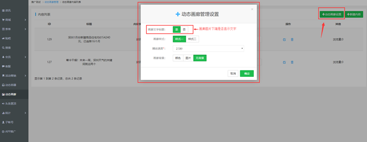 2,新建動(dòng)態(tài)畫(huà)廊源之后,點(diǎn)擊“管理”,進(jìn)入動(dòng)態(tài)畫(huà)廊內(nèi)容列表,點(diǎn)擊“動(dòng)態(tài)畫(huà)廊設(shè)置”,設(shè)置動(dòng)態(tài)畫(huà)廊文字標(biāo)題顯示、畫(huà)廊樣式、播放速度及畫(huà)廊背景等。