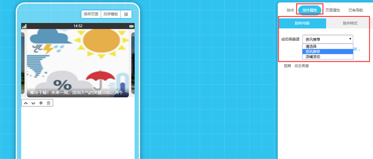 4, 應(yīng)用公園運(yùn)營(yíng)管理后臺(tái)完成設(shè)置之后,進(jìn)入制作頁(yè)面。右側(cè)“高級(jí)控件”中,直接將“動(dòng)態(tài)畫(huà)廊”控件拖進(jìn)中間模擬器;設(shè)置控件屬性和頁(yè)面屬性,選擇動(dòng)態(tài)畫(huà)廊源,直接調(diào)取后臺(tái)動(dòng)態(tài)畫(huà)廊中的內(nèi)容。