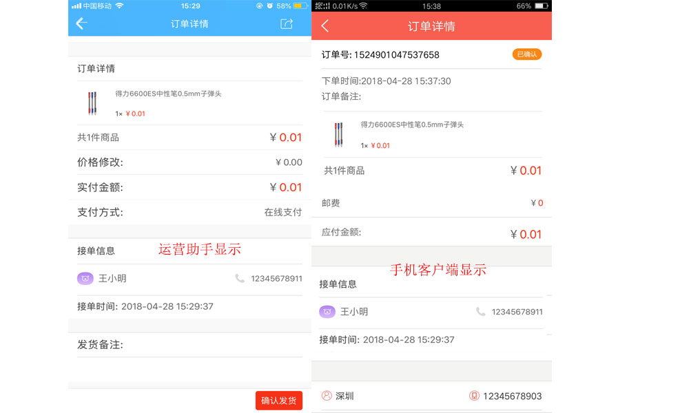 3.搶單后運(yùn)營管理平臺(tái)/應(yīng)用運(yùn)營助手/用戶客戶端的訂單頁面均會(huì)顯示訂單配送員信息,讓商戶或買家更加方便聯(lián)系配送員。