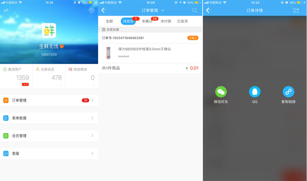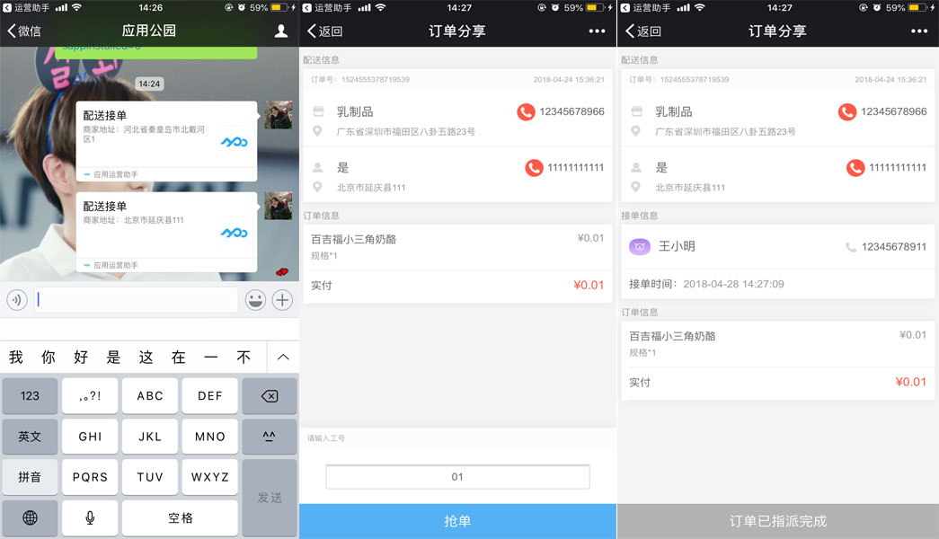 2.登錄手機(jī)運(yùn)營助手,接收訂單之后,進(jìn)入訂單詳情頁面,點(diǎn)擊右上角的分享界面,把訂單分享到微信、QQ群里,配送員輸入工號(hào)進(jìn)行搶單,搶單成功之后,按照訂單上的地址進(jìn)行配送。