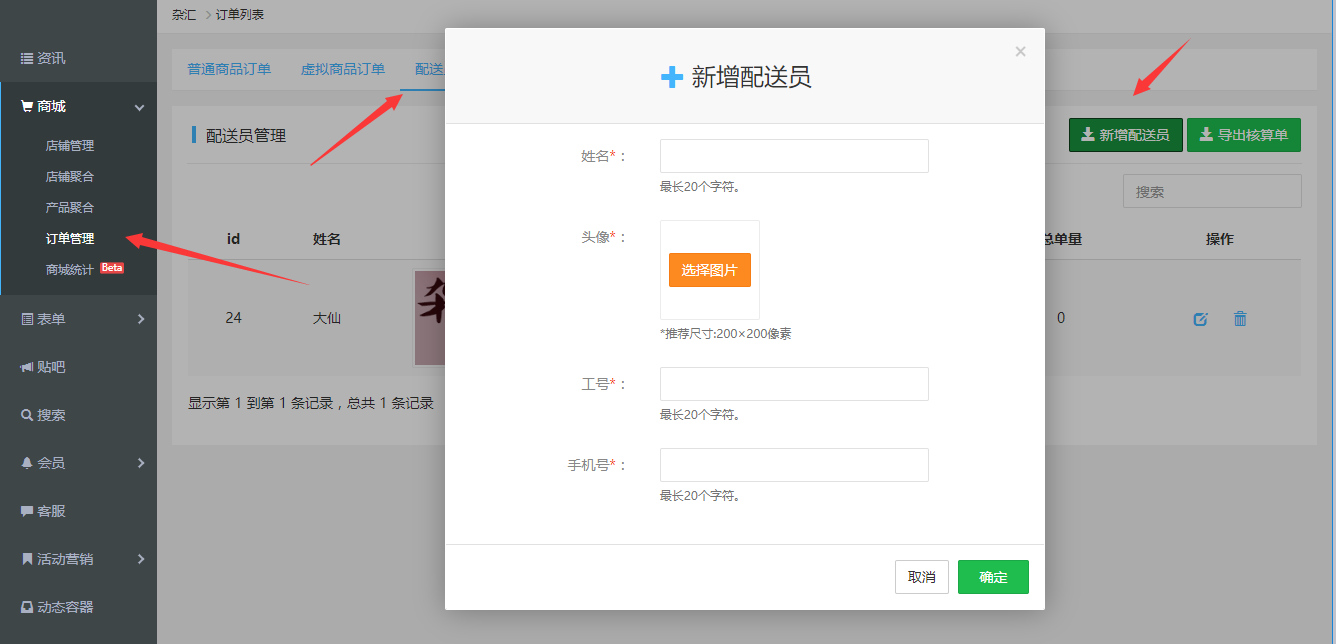 1.進(jìn)入運(yùn)營管理后臺(tái)-訂單管理-配送員設(shè)置,新增配送員,填寫配送員的相關(guān)信息。