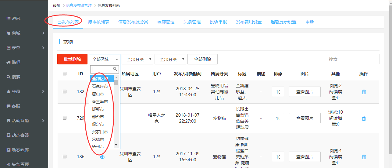 2.已發(fā)布/待審核列表可以根據(jù)全部區(qū)域/城市查看并進(jìn)行相關(guān)操作(子賬號(hào)只能查看指定管理權(quán)限的信息發(fā)布源)。