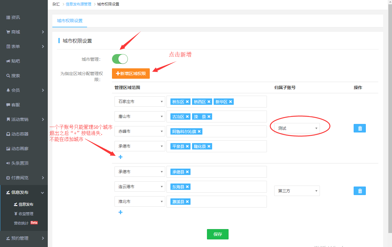 1. 進(jìn)入運(yùn)營(yíng)管理后臺(tái),打開城市管理,添加指定城市分配管理權(quán)限,并設(shè)置管理子賬號(hào), 每個(gè)子賬號(hào)只能管理50個(gè)城市,超出不能在添加,