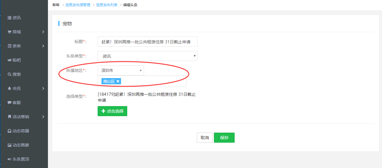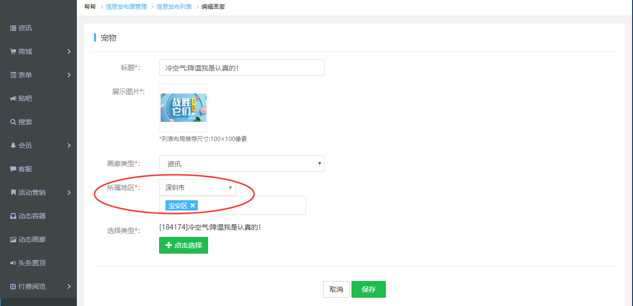 3.新增畫廊/頭條管理按城市展示,在“所屬地區(qū)”里選擇城市,切換城市可以根據(jù)這里顯示不同的畫廊/頭條內(nèi)容。