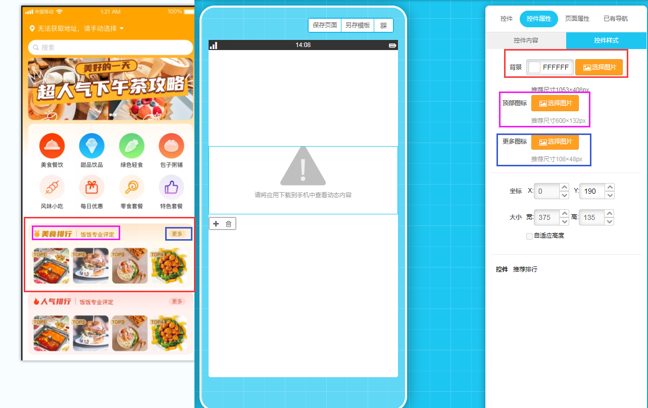 5.制作頁面把相應(yīng)的控件拖到制作頁面里,按提示尺寸設(shè)置:背景、頂部背景、更多圖標(biāo)