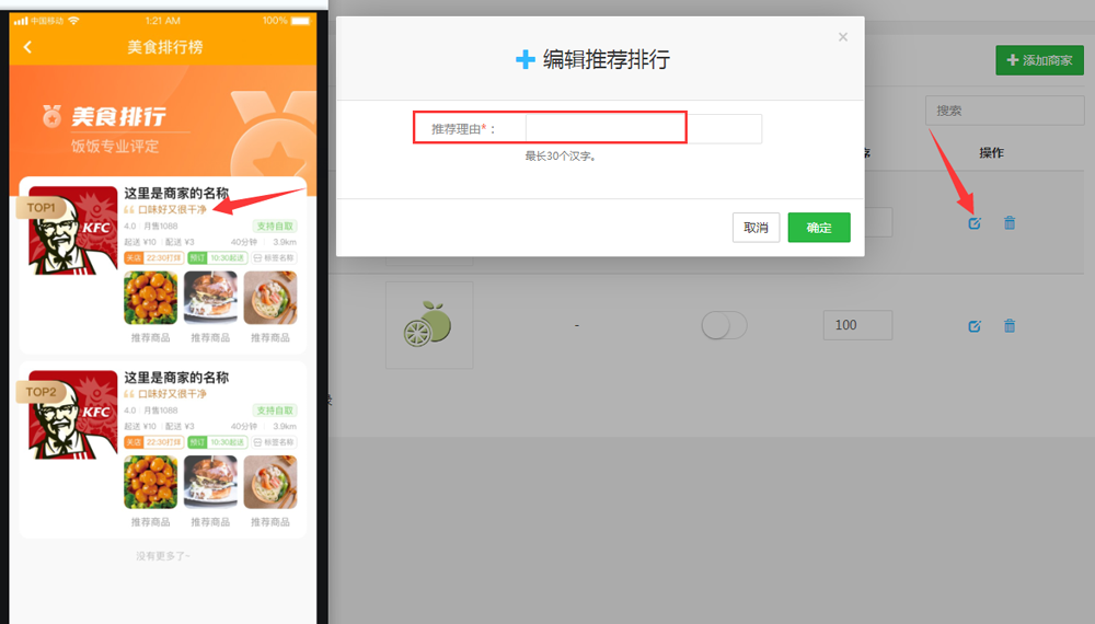 4.已添加好的商家可點擊修改編輯:推薦理由 展示位置如下圖
