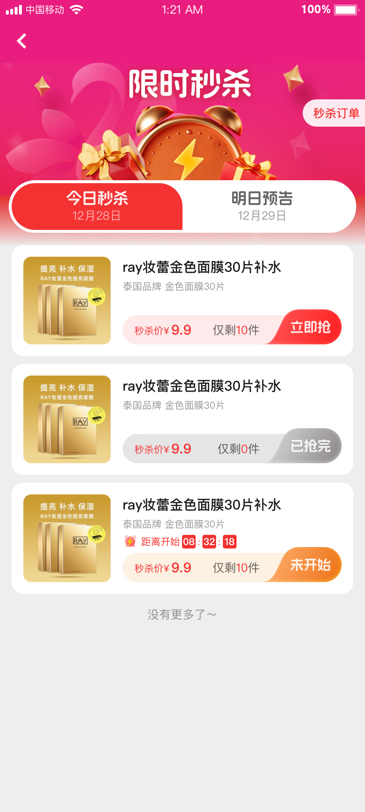 1.支持設(shè)定每日秒殺商品,用戶不僅可參與今日秒殺,還能查看明日秒殺商品;