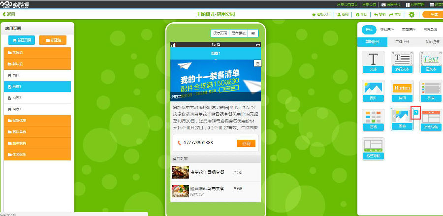 5、開(kāi)始制作:左邊的是應(yīng)用頁(yè)面,中間的就是制作頁(yè)面,右面的各個(gè)功能控件及調(diào)整。點(diǎn)擊右上角有各個(gè)模塊的幫助,當(dāng)然點(diǎn)擊單一功能控件的“?”就會(huì)彈出該功能的使用教程。
