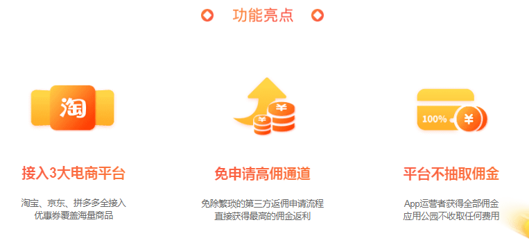 2、免申請高傭通道:如果是個人開發(fā)者身份或者是小公司,很難申請到電商平臺的高勇通道,比如京東平臺就對分銷商有一定的實力要求。而應(yīng)用公園借助強(qiáng)大的品牌力,直接獲取3大平臺較高傭的通道。幫助淘寶客APP開發(fā)者免除繁瑣的申請流程,直接獲得較高的傭金返利