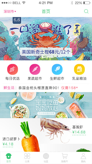 6、LBS位置定位:用戶能夠通過位置定位的功能,定位附近提供生鮮產(chǎn)品服務的商家,或者用戶能夠通過設(shè)置相應的搜素范圍,隨時獲得商家的新品上市的信息,及時采購新鮮可口的商品。