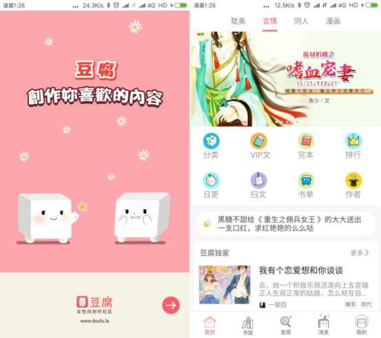 豆腐APP主要通過優(yōu)質(zhì)的網(wǎng)文小說、漫畫、動(dòng)漫視頻的推送,讓廣大潛伏的腐女可以在這里盡情享受、互動(dòng)、交流、分享,迅速找到“臭味相投”的腐友。