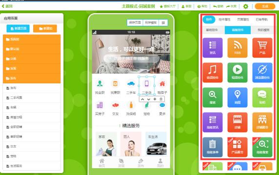 進入應(yīng)用公園的編輯制作頁面,我們可以看到左面就是欄目頁,中間就是APP的模擬器,右邊就是具體的功能。